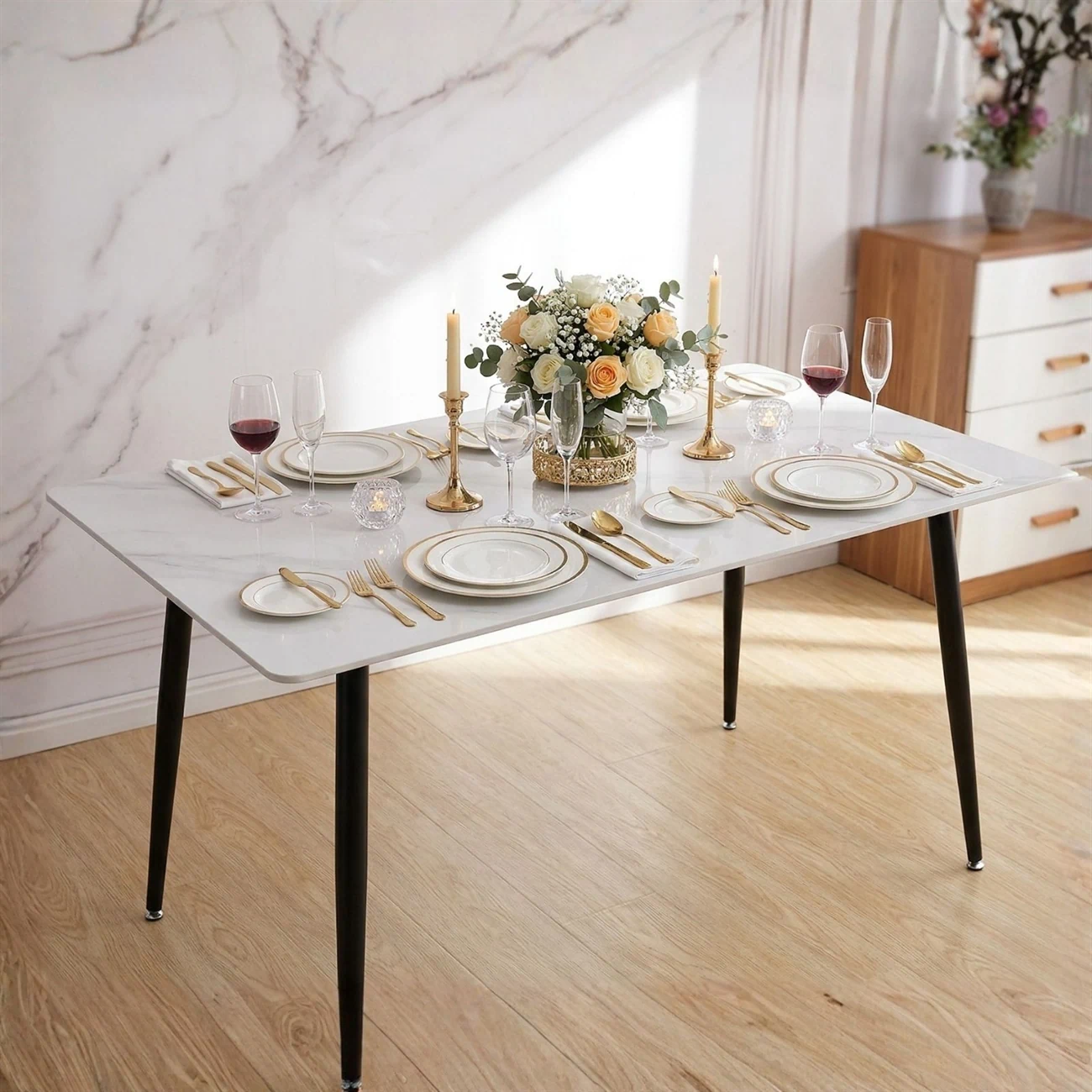 השולחן עומד על בסיס ורגלי מתכת שחורות מעוצבות, המעניקות לו יציבות מקסימלית ומראה עדכני.